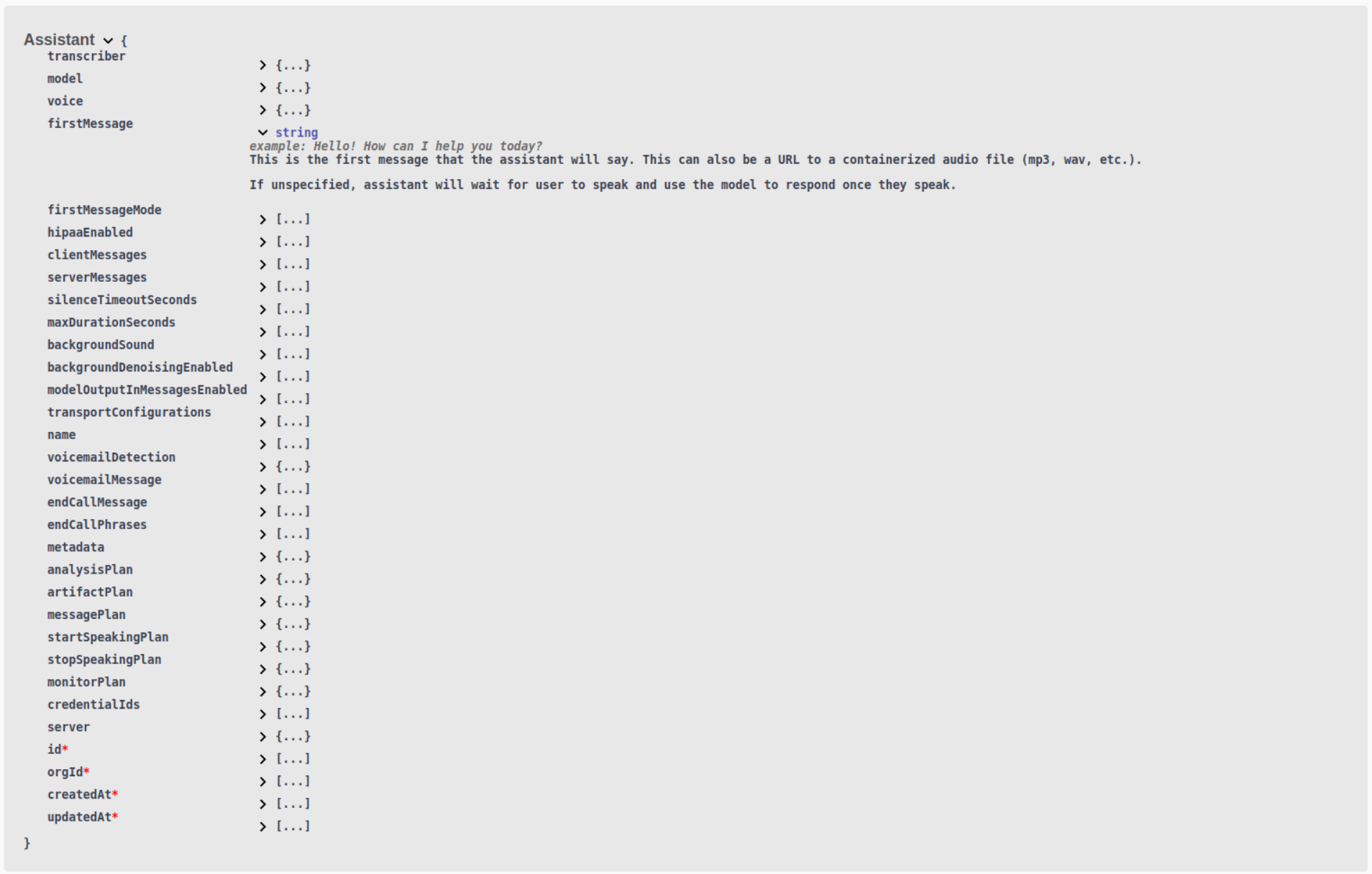 Refer to the Assistant schema for more information: https://api.vapi.ai/api