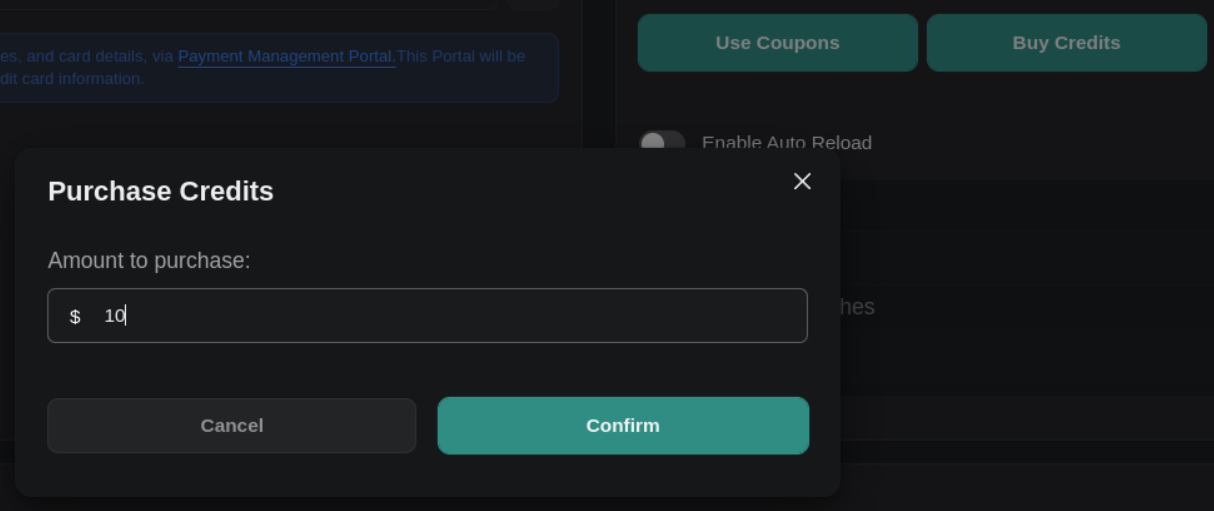 New Credits Purchase Option: You can now purchase credits to your subscription by navigating to the updated billing page. Specify the dollar amount of your credits in the