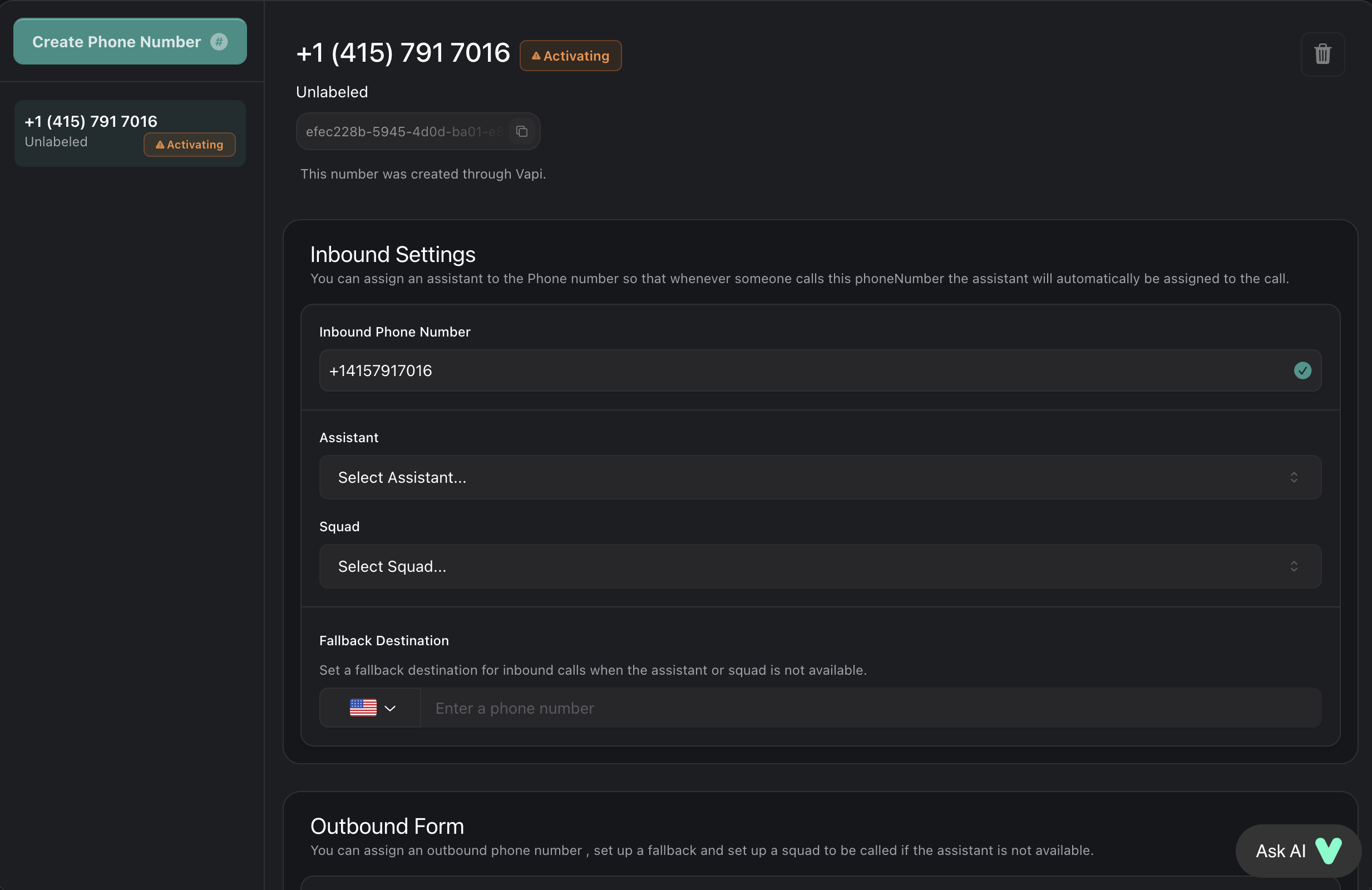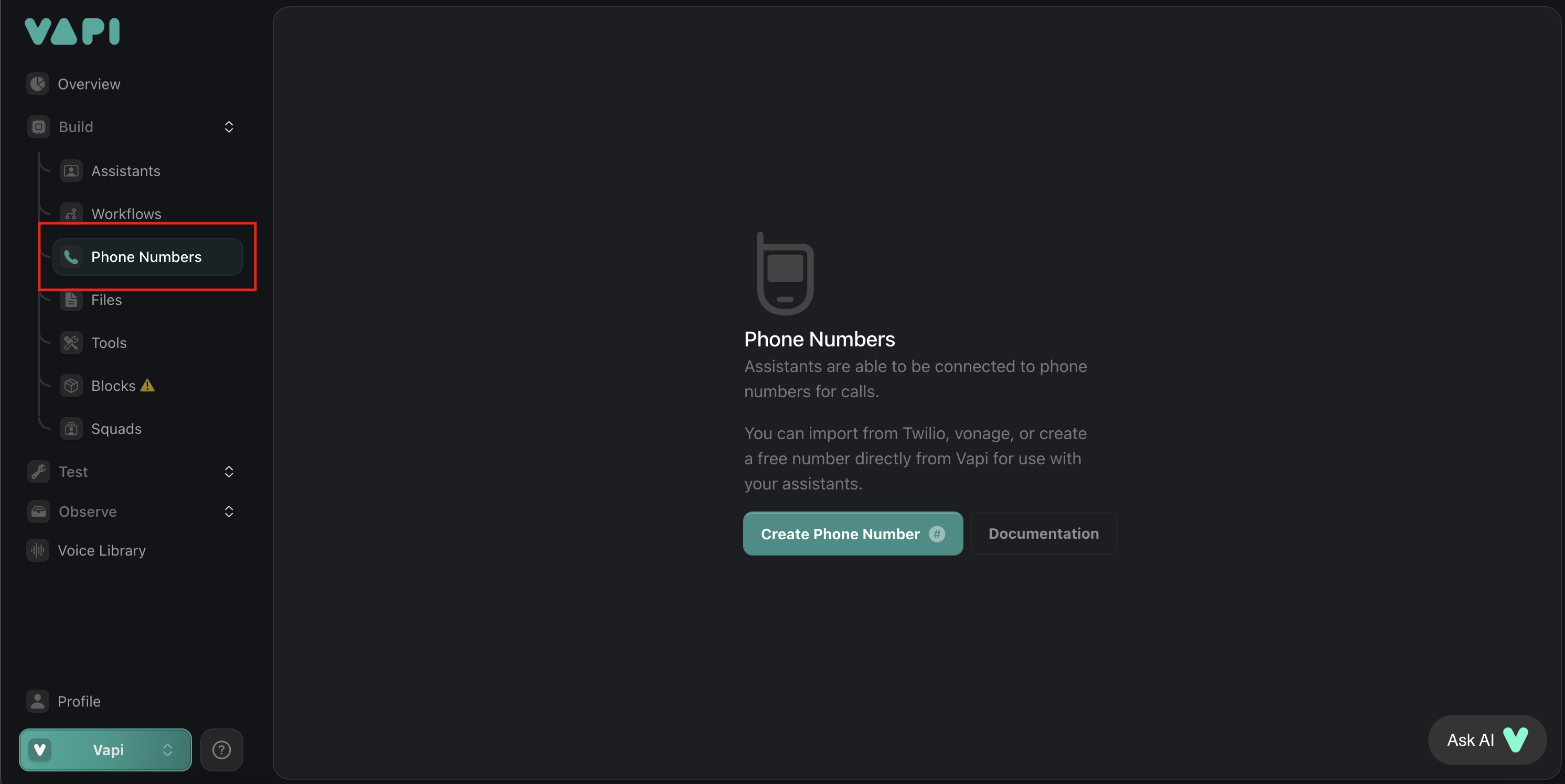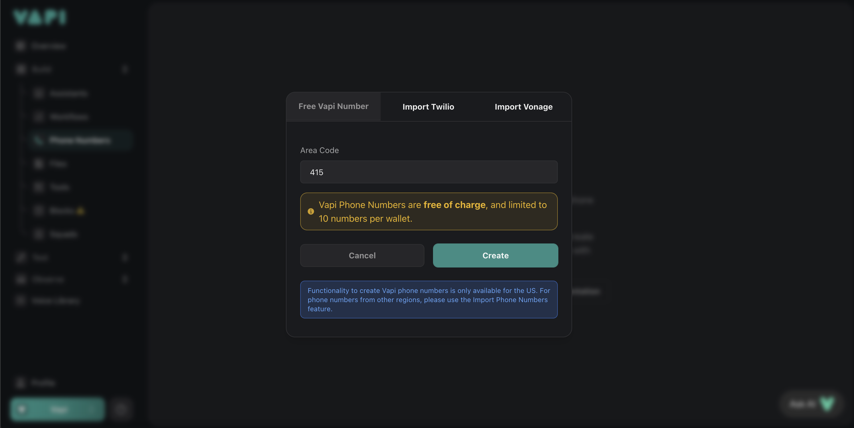 This guide details how to create free phone numbers on the Vapi platform, which you can use with your assistants or squads.