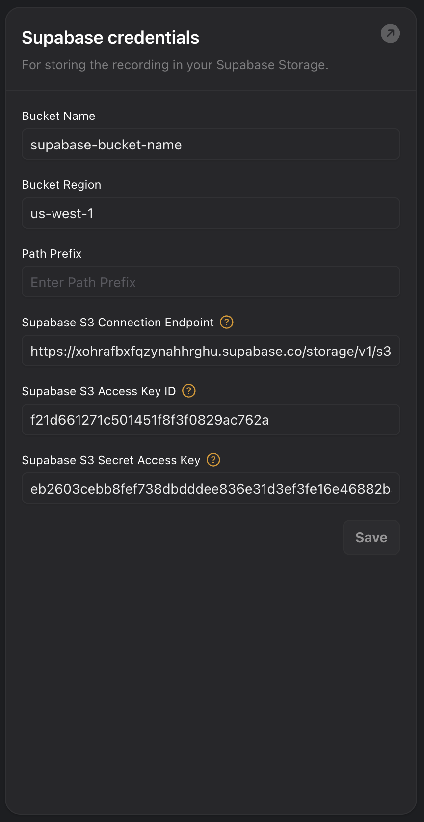 Your assistants can be configured to record chat conversations and upload the recordings to a bucket in Supabase Storage when the conversation ends. You will need to configure the credential and bucket settings in the “Cloud Providers” section of the “Provider Credentials” page in the Vapi dashboard.