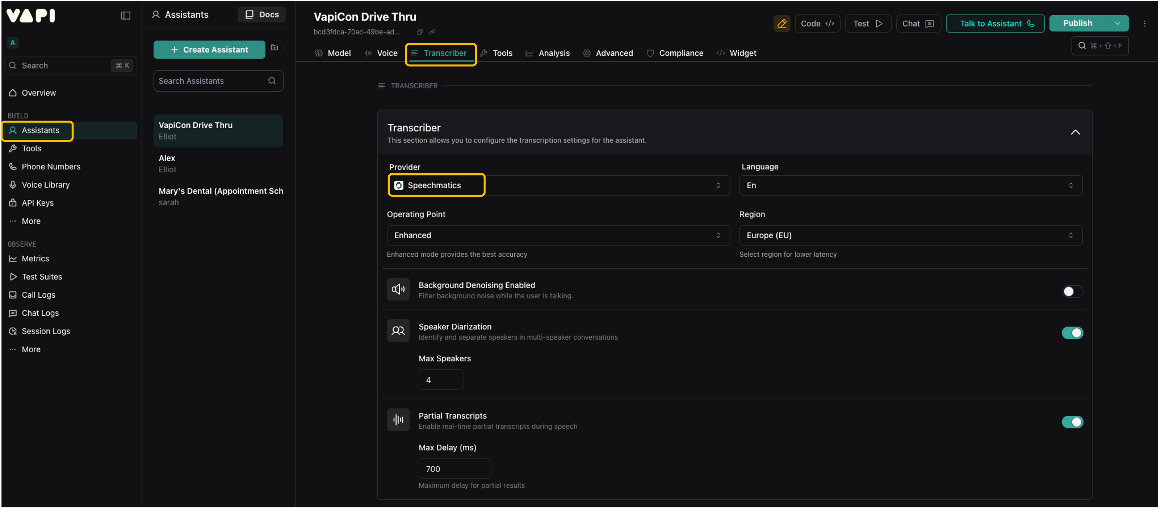 Speechmatics is the only transcriber on Vapi to provide speaker diarization — the ability to identify who said what in multi-party conversations. Each word is labeled with a speaker label.