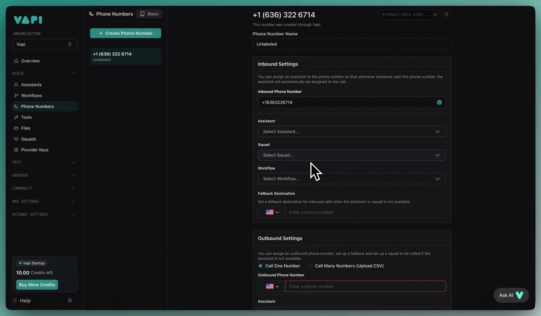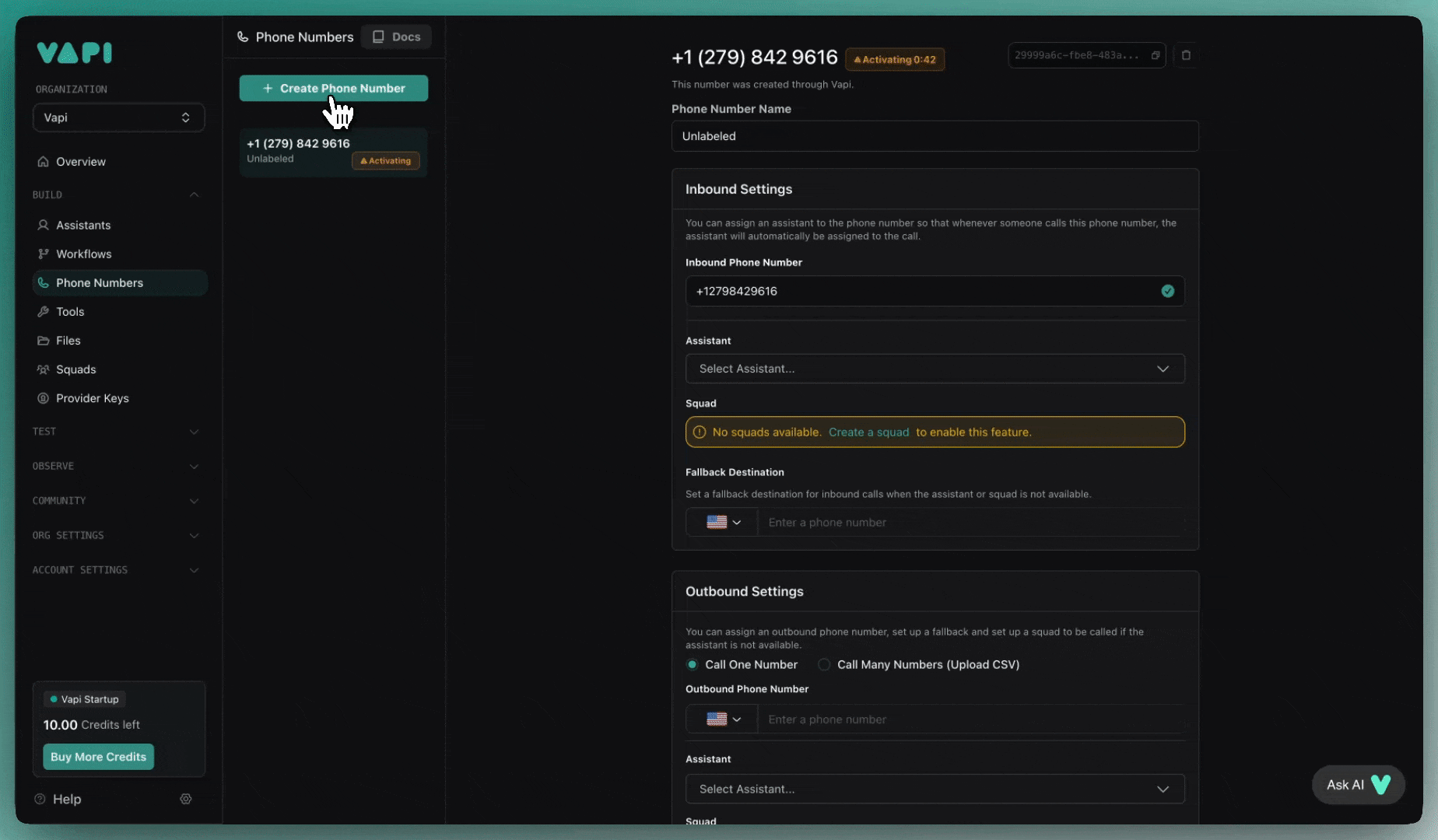 Call the phone number you just created. Your assistant will pick up and start the conversation with your configured first message.