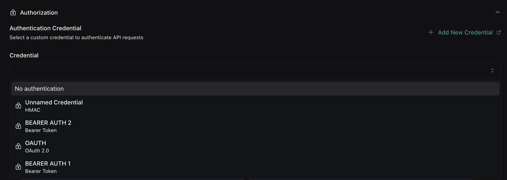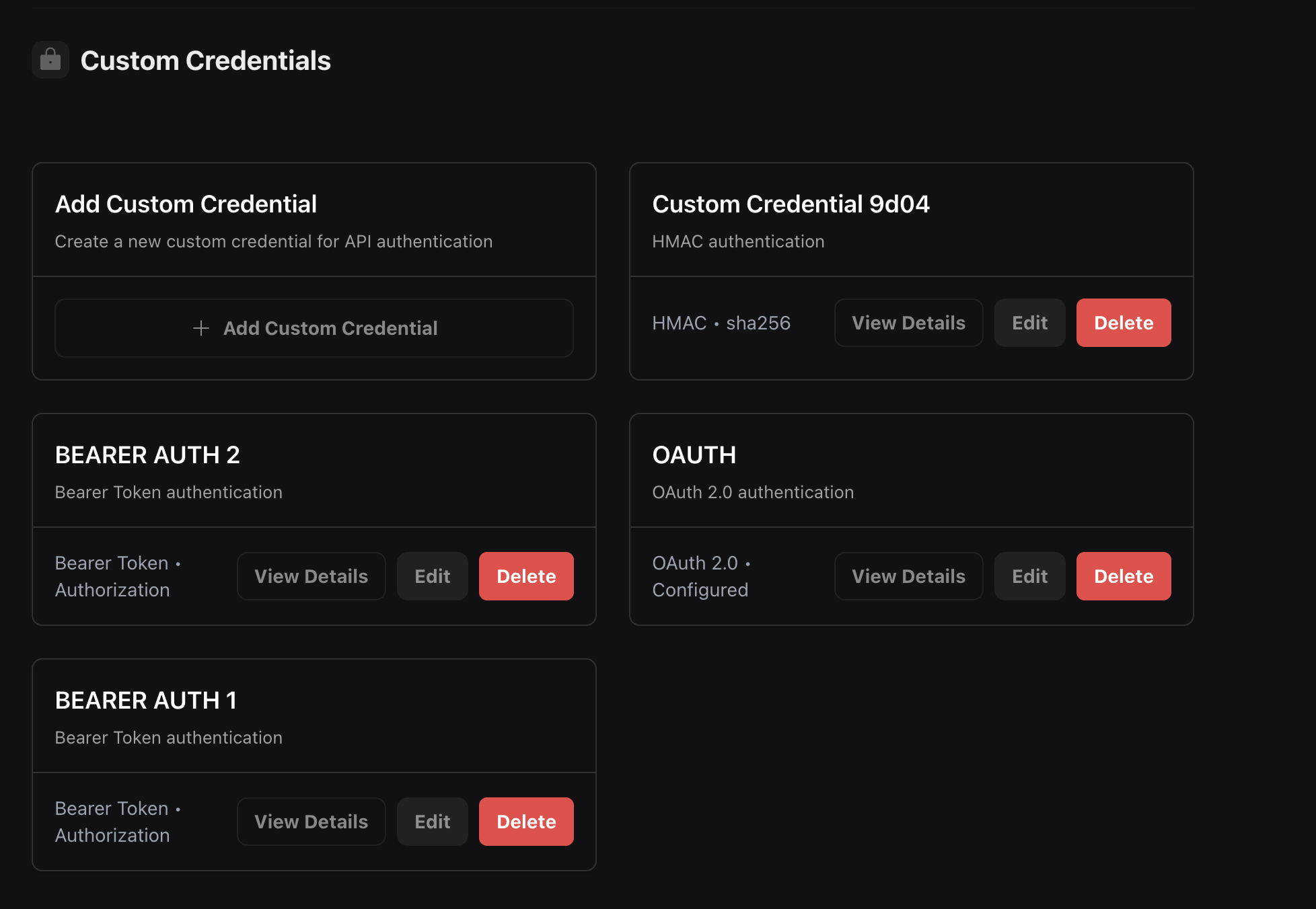 Credential Naming: Use descriptive names like “Production API Key” or “Staging OAuth” to easily identify credentials.