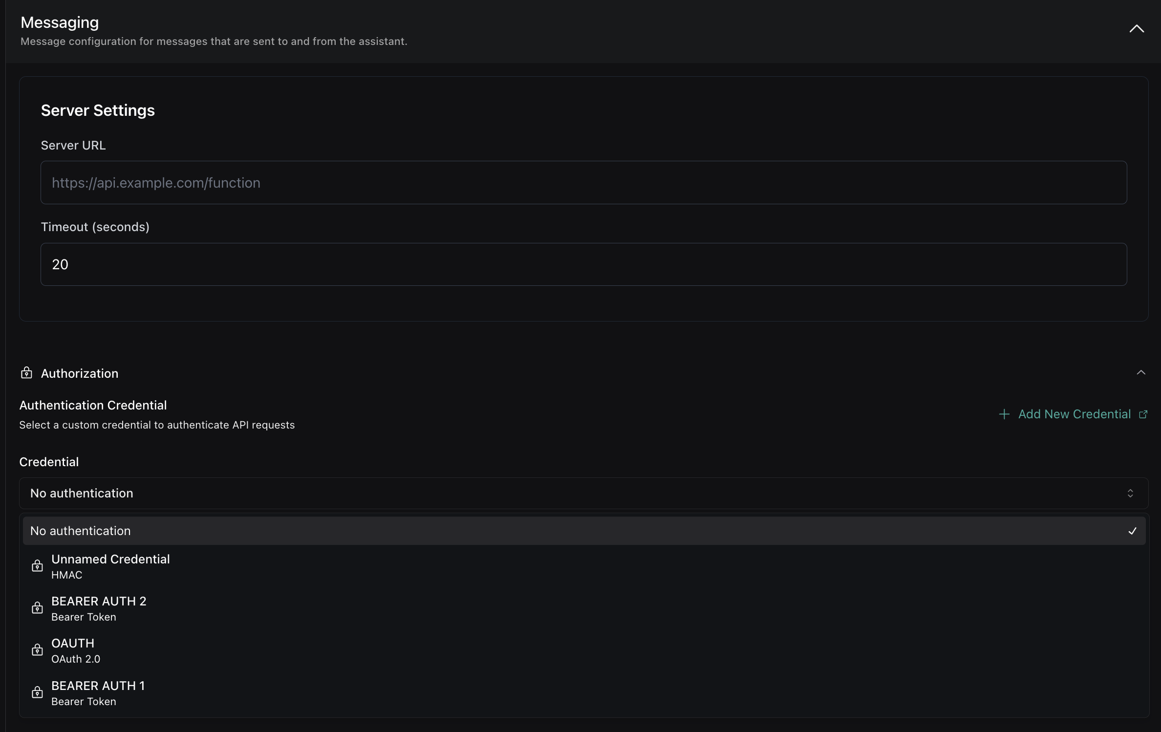 When configuring webhooks for your assistant, you can authenticate your server endpoints by creating Custom Credentials and referencing them using a credentialId. This approach provides better security, reusability, and centralized management of your authentication credentials.